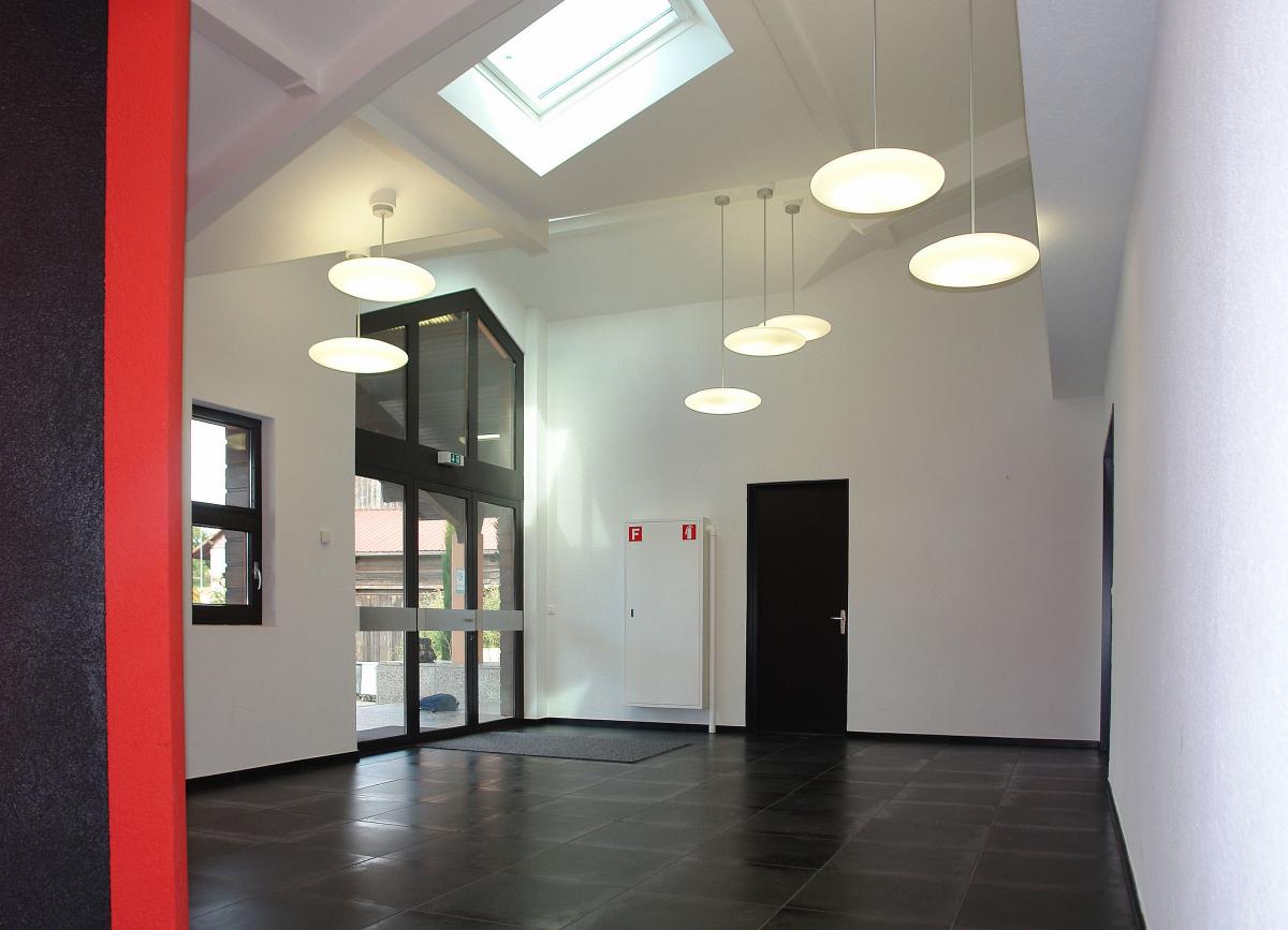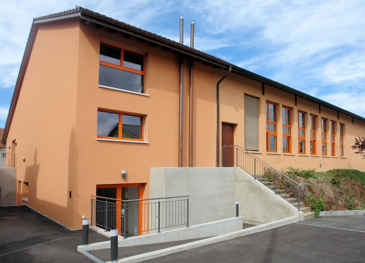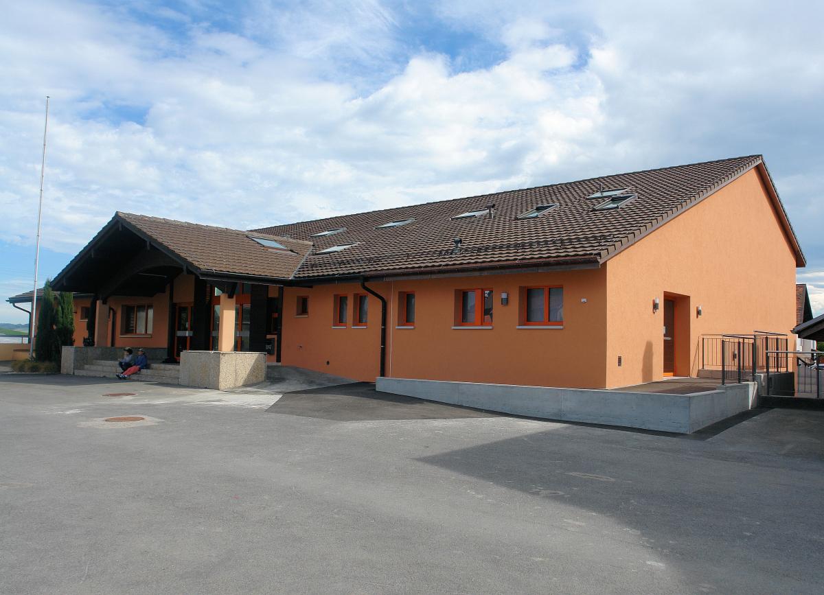 La salle polyvalente de Gollion, construite il y a trente ans a besoin d'espace de service pour les engins de gymnastique et le stockage des chaises. D'autre part, le hall d'origine est un peu exigu et les sanitaires ne sont pas équipés pour les handicapés. Une nouvelle installation de chauffage par pompe à chaleur éothermique avec panneaux rayonnants au plafond pour la salle, a été dimensionnée pour une extension future vers l'auberge.