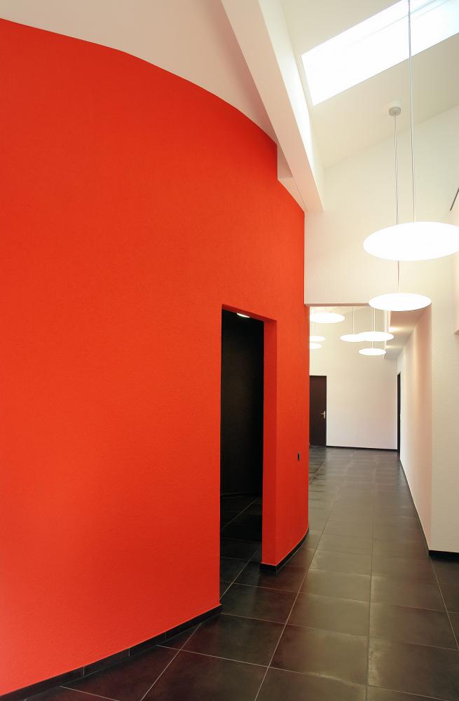 Au rez supérieur, il y a le hall d'entrée, les sanitaires et les locaux de rangement pour engins de gym et chaises.