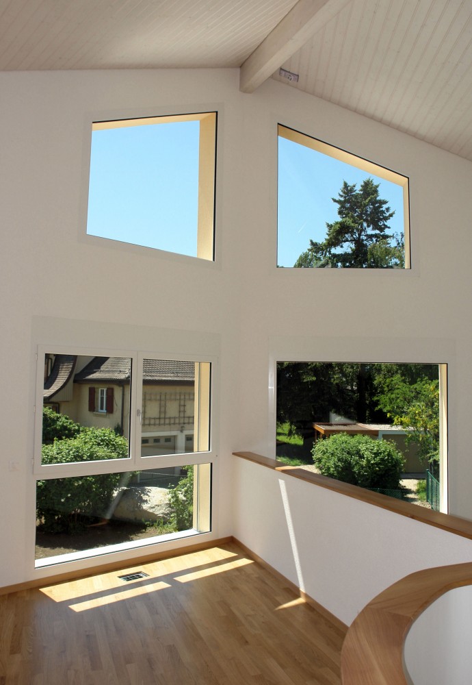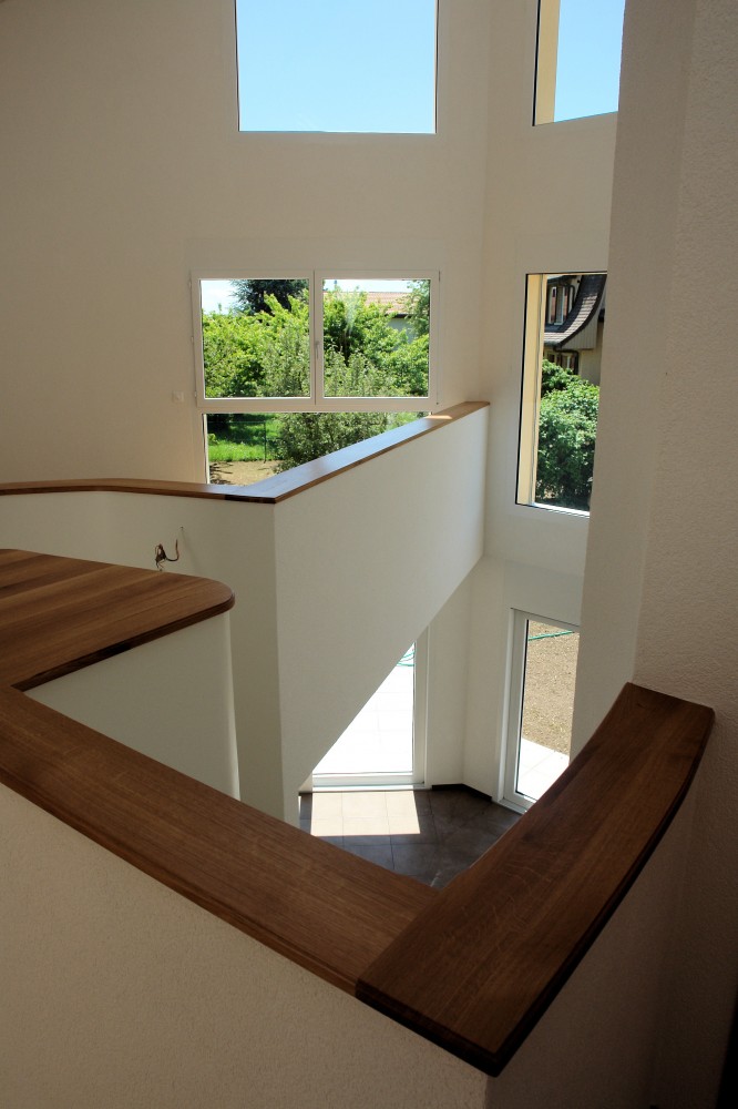 La distribution autour de l'escalier central offre des perspectives variées et agit comme un filtre entre l'entrée et la zone de vie.